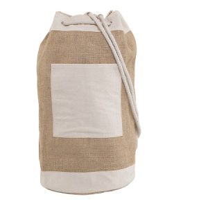 Jute duffel bag with metal eyelets, a cotton cord and front pocket.