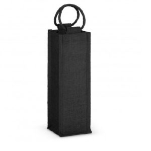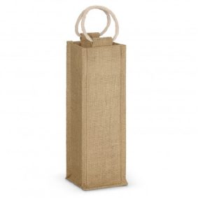 Single bottle wine carry bag which is manufactured from environmentally friendly laminated natural jute with unbleached woven cotton handles.