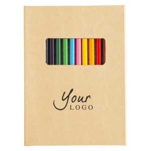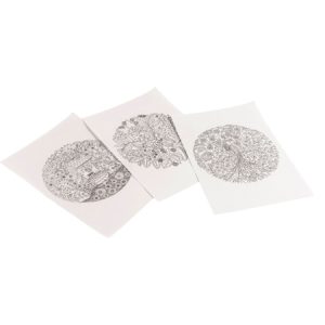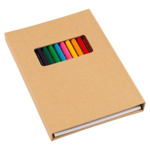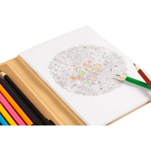 Cardboard colouring folder for adults, with 10 designs, 40 blank pages, and 12 coloured pencils. The colouring book is not attached to the cover.