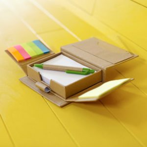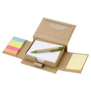 Cardboard memo holder, including a plastic ruler in the lid, 150 sticky notes, a note block of 160 blank sheets, and a pen loop with ballpen, blue ink.
