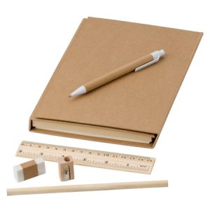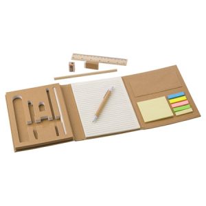 Cardboard writing folder, including: notepad with 40 sheets, bamboo ruler (15 cm), cardboard pen with plastic tip, clip and button (blue ink), two pencils, a pencil sharpener, an eraser, post-its (25 sheets per colour), and an interior pocket.