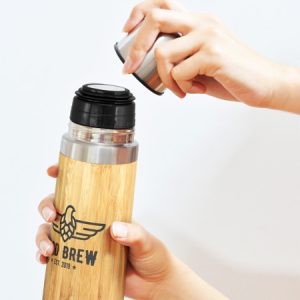 Make a statement with this 500ml, nature-inspired double wall flask which has a genuine bamboo outer wall. It has a stainless steel inner wall and its own screw on cup with a smart stainless steel finish. The flask will keep drinks hot or cold for longer and has convenient push button operation. It is BPA-free and is presented in a black gift box. This product is not dishwasher safe and handwashing is recommended. Bamboo is a natural material which produces unavoidable variances in the grain pattern, colour and branding.