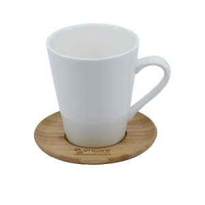 This gift-set contains 2  mugs and saucers and is supplied packed in a sturdy gift box with cleat lid. The classic ‘V’ shape of this quality ceramic mug, combined with the natural look of the bamboo saucer makes this a truly unique gift. The saucer, featuring your logo, is crafted from environmentally friendly bamboo and adds to the overall look and feel of this product. Because of the unique nature of bamboo, the product and engraving colour may vary from item to item. As this product is hand crafted, the saucer may differ slightly in shape and size across the order.