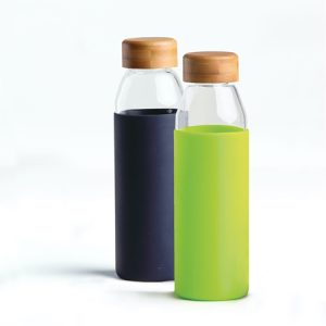 High borosilicate glass bottle.  Bamboo lid.  Bespoke twist on leak-proof lid.  Easy grip protective coloured silicone sleeve.  BPA Free.  Supplied: in a black po ‘di fame presentation tube (24.5cm x 8.5cm Dia.)