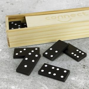 Classic game of domino’s where players take turns placing a domino on the table that matches the number of dots on the end of a previously placed domino. The domino’s and instructions are presented in a wooden box with a sliding lid. Branding is on the lid which laser engraves to a natural etch.