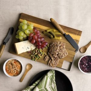 7-pcs set includes serving board with metal handle, 2 x spoons, 2 x bowls, 3.5” cheese knife and 3” spreader knife. Acacia displays its own character through its unique wood grain and subtle patina finish. Supplied: in a bespoke black po ‘di fame presentation box with magnetic closure (41.5cm W x 33cm H x 5cm D). Materials: Plantation grown Acacia hardwood board FDA grade food oil finish, Matt black Stainless steel / Acacia hardwood knives, Acacia spoons, Ceramic bowls