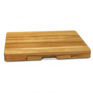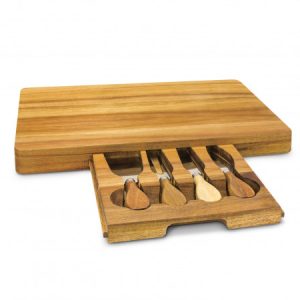 Elegant cheese board which is manufactured from acacia wood. It has four soft non-marking pads on the base and a compact drawer which opens to reveal a set of three cheese knives and a cheese fork. It laser engraves to a natural etch and is beautifully presented in a matt black gift box. Wood is a natural material which produces unavoidable variances in the grain pattern, colour and branding.