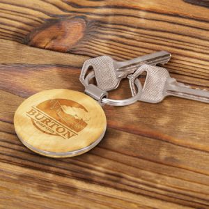 Round natural beech wood key ring with decorative metal trim. It laser engraves to a natural etch and is beautifully presented in a black gift box. Wood is a natural material which produces unavoidable variances in the grain pattern, colour and branding.