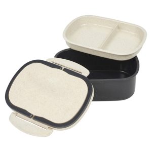Pack your food in style with the plastic and wheat straw lunch box. This item features a tray to keep your food separated and a locking lid with handles for carrying. Made of 30% Wheat Straw + 70% polypropylene. Dishwasher and Microwave Safe