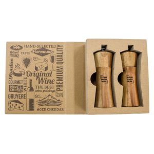 Traditional grinding styled salt and pepper mills add a touch of class to any table. Acacia wood is known for its unique and natural contrasting patterns, no two units are identical. Presented in a premium book style gift package. Please be aware of a key characteristic of wood, our acacia wood has both visible growth rings and straights grains, no two wood products will be the same. We can laser engrave however please note no two products will have the same outcome. We encourage Food Grade Ink, which is FDA approved.