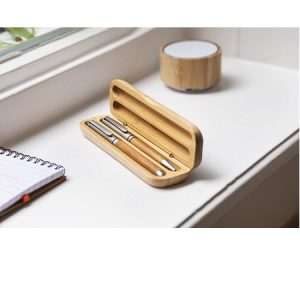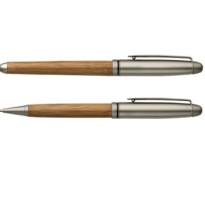 Bamboo writing set, consisting of a ballpen and rollerball pen. Packaged in a bamboo pen case. Blue ink.