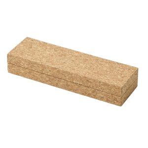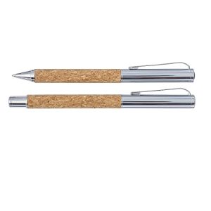 Cork and chromed metal writing set consisting of a ballpoint pen and rollerball pen. Blue ink. Packaged in a cork pen case with velvet lining.