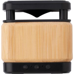 Bamboo and ABS wireless speaker and wireless mobile phone charger. Input 5V 1.5A. Wireless output 5V 0.8A. 3 Watt speaker. 400 mAh battery. Anti slip bottom and top. Including micro USB – USB charging cable.